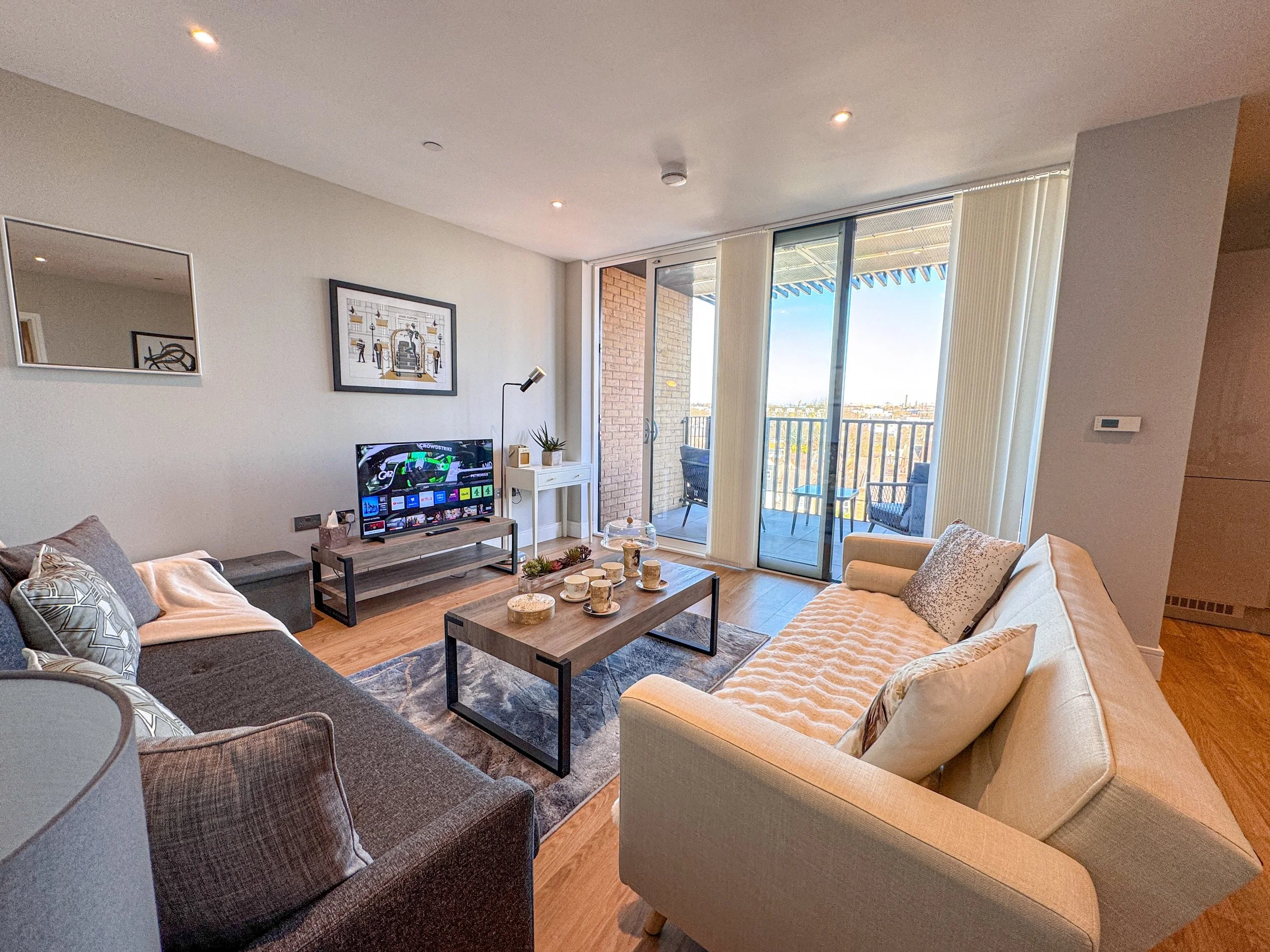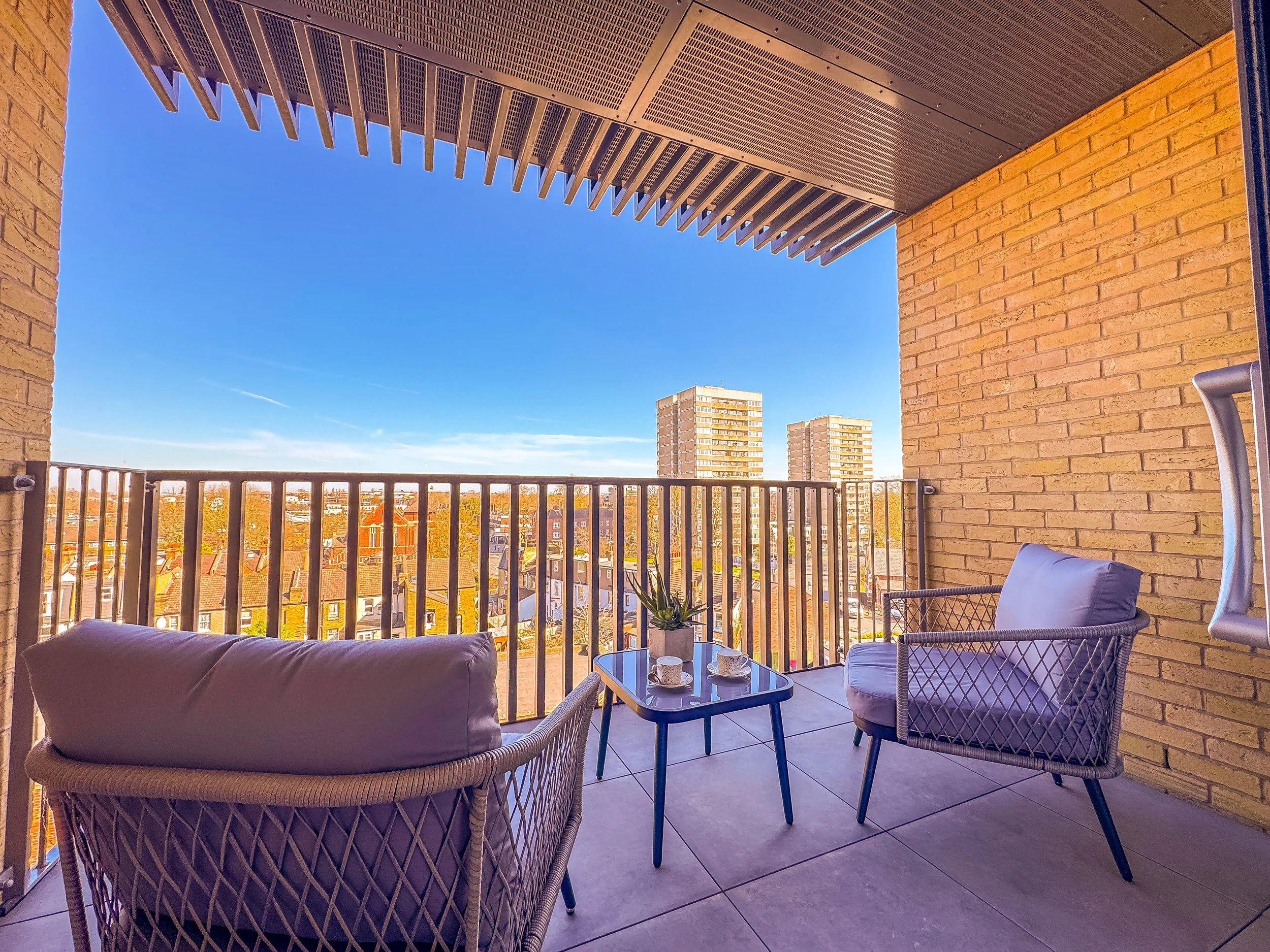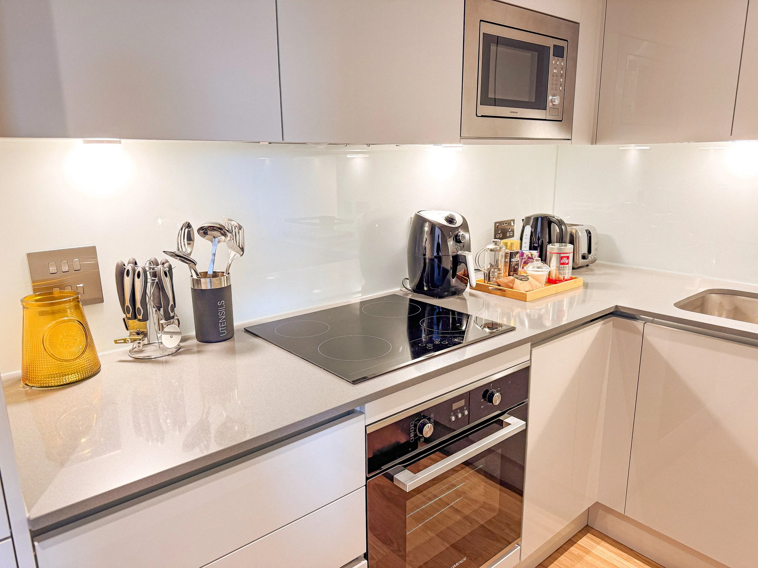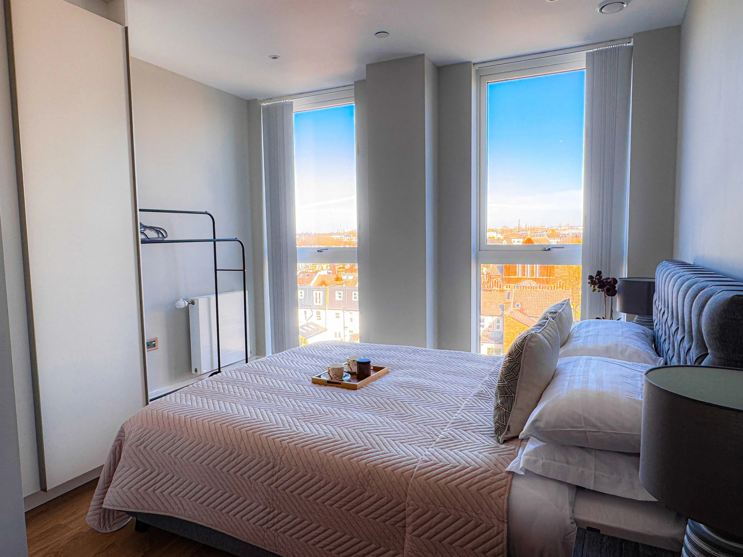 This stylish 1BR apartment in a secure gated compound offers 24/7 concierge service and a spacious communal garden. The bright bedroom ensures restful nights, while the living room features a comfy sofa bed for extra guests. Enjoy a sleek kitchen, washer/dryer, and a portable AC unit. Step onto the balcony for stunning views and relaxing seating. Conveniently located near transport, shops, and dining- your ideal London retreat!