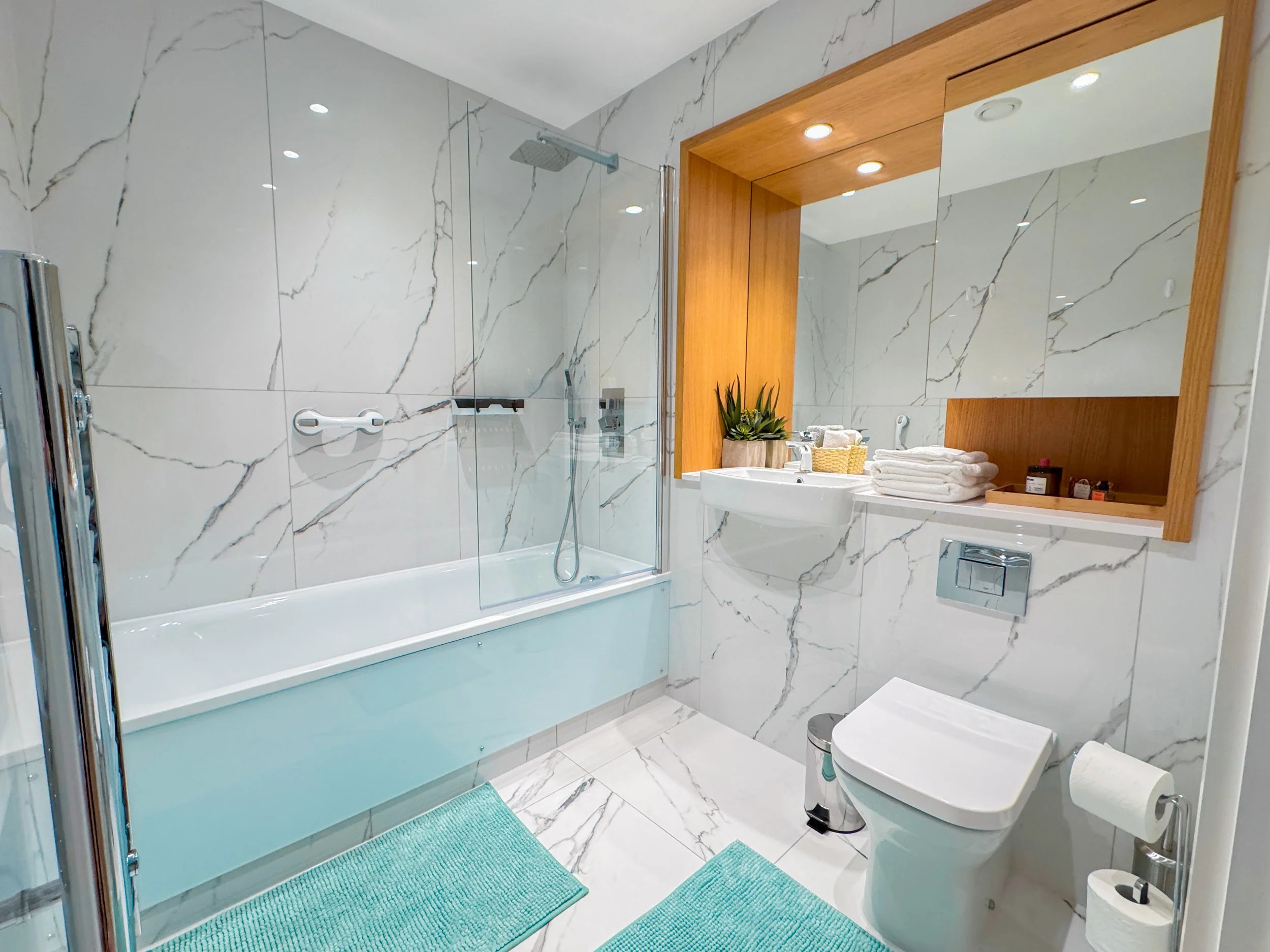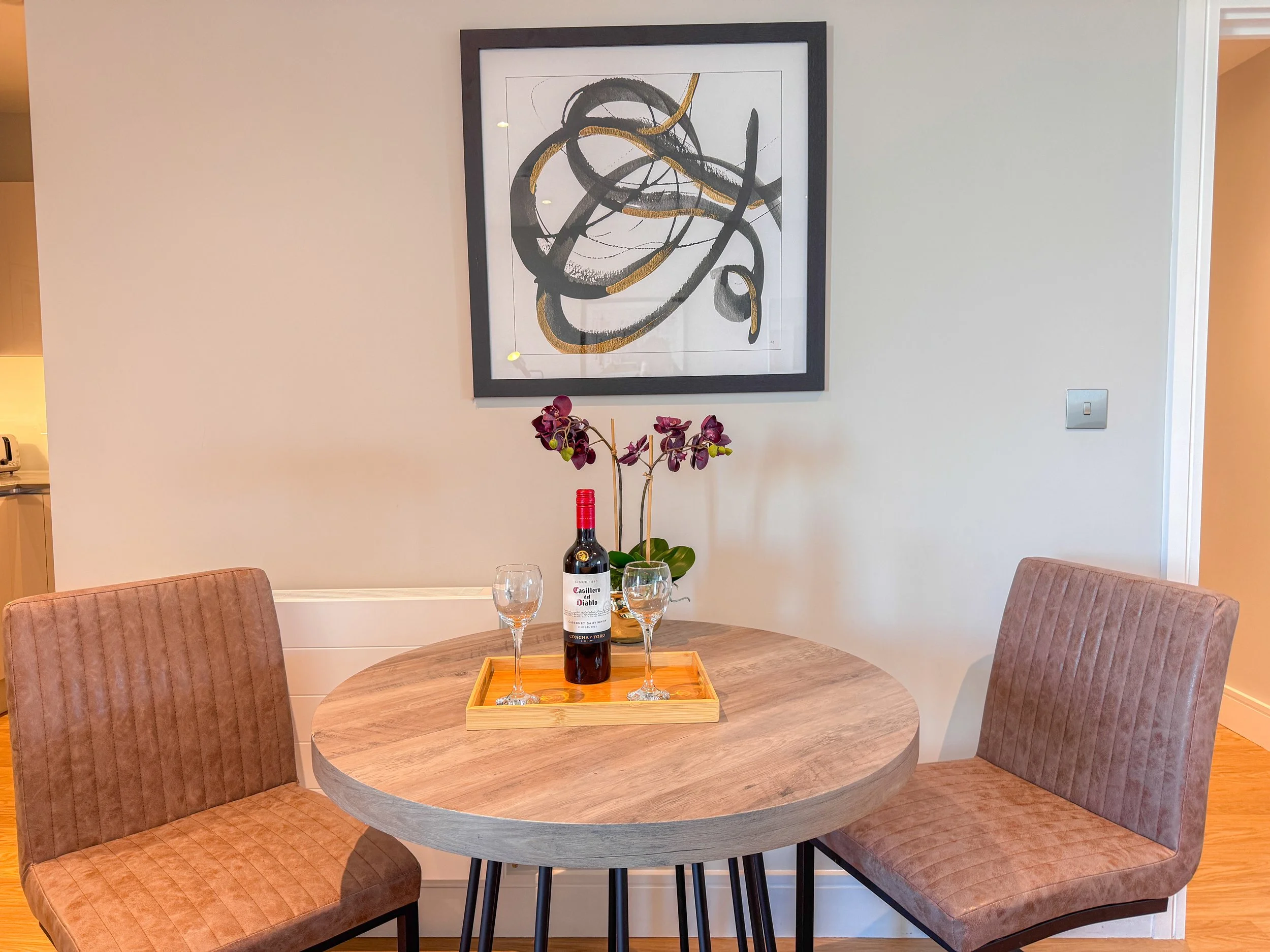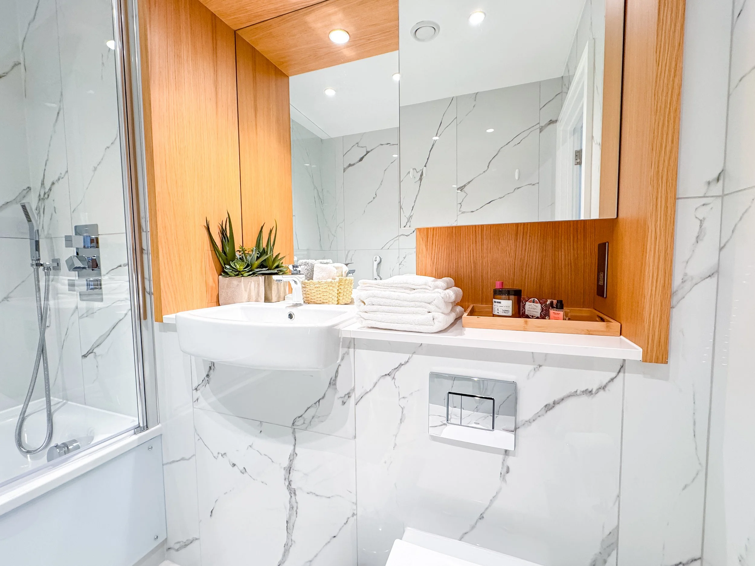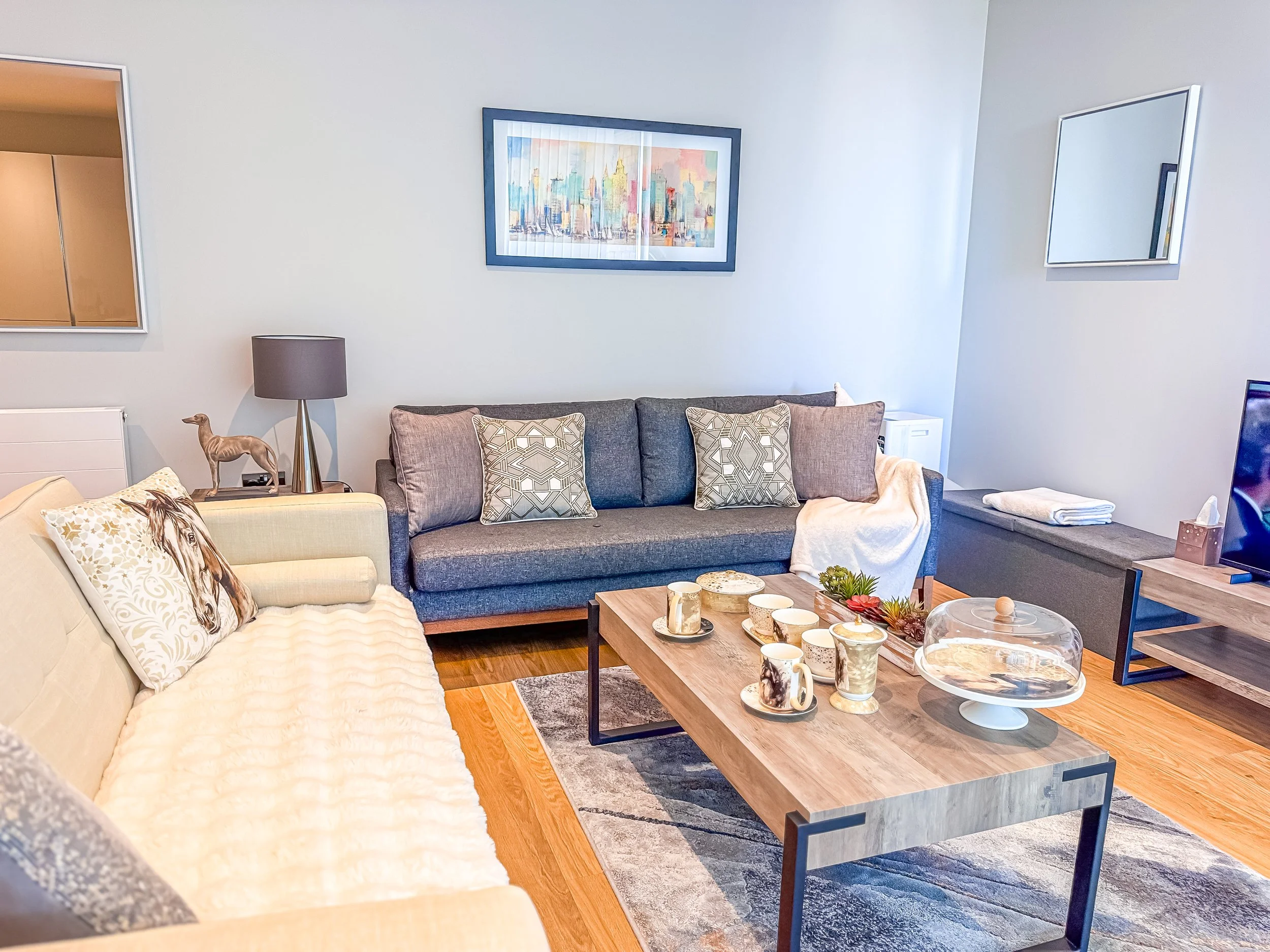 This stylish 1BR apartment in a secure gated compound offers 24/7 concierge service and a spacious communal garden. The bright bedroom ensures restful nights, while the living room features a comfy sofa bed for extra guests. Enjoy a sleek kitchen, washer/dryer, and a portable AC unit. Step onto the balcony for stunning views and relaxing seating. Conveniently located near transport, shops, and dining- your ideal London retreat!